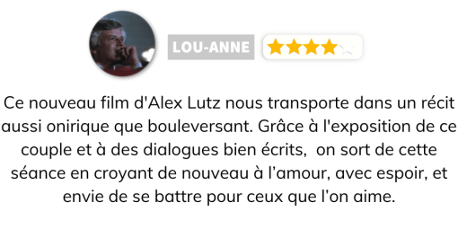 Un nouveau long-métrage maîtrisé jusque dans ses dialogues les plus profonds. Nous suivrons ici, deux personnages que tout semblent opposer. Deux adultes menant une vie de famille établie et déjà bien rangée. Vie de couple, voire même vie familiale. Et c’est après qu’ait lieu une hasardeuse engueulade dans un métro plein à craquer, que nos deux protagonistes passent une nuit qui va probablement changer leurs vies. Une Nuit est une bulle temporelle dans laquelle on ne voit rien passer. Nous sommes seuls dans une salle de cinéma à vivre l’instant présent et à se lier d’attachement pour ces deux personnages campés par une Karin Viard touchante et un Alex Lutz bluffant de naturel. Nous oublions très rapidement que nous avons à faire à un film, tant le tout est sublimement orchestré et semble se rapprocher du réel de manière brillante et fine. Tous les dialogues sont d’une poésie sans nom et peuvent questionner le spectateur sur sa relation à l’amour, la vie, le temps qui passe, et sur cette alchimie se baladant dans l’air et pouvant faire basculer deux vies aussi subitement.