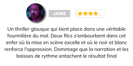 Et c’est là que le duo d’inspecteurs est intéressant, l’un et l’autre se complètent, et bien que le plus jeune (très droit dans ses bottes) soit trop peu exploité, il n’en reste une dynamique permettant aux deux d’évoluer au fur et à mesure du long-métrage. La lumière est extrêmement bien maîtrisée, permettant d’avoir cette image très sale au travers de la pluie, dans les ruelles sombres et dangereuses de la ville, où se rencontrent crimes et déchetteries. Idem de la mise en scène, avec des cadres larges montrant aussi bien l’immensité de la ville comme l’isolation des personnages selon les situations. Résultant une immersion totale dans cet univers au final presque dystopique et pourtant parfaitement contemporain. Cependant, on ne peut que noter un traitement pas assez poussé de certains personnages, et surtout des situations absolument ridicules dans le dernier acte. C’est dommage, car le film avait jusque là un rythme efficace et un bon déroulement de l’histoire, avant de finir avec des longueurs inutiles et parfois complètement stupides.