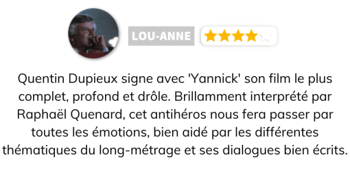Une très belle surprise de Quentin Dupieux, qui nous montre ici un film aussi drôle que étonnamment émouvant. Yannick évoque des questionnements artistiques forts derrière une situation absurde frôlant par moment le drame. Une vraie bouffée d’air frais dans le paysage cinématographique français.