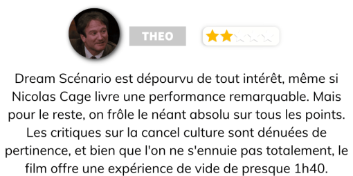D’ailleurs, le film porte assez bien son nom. Le scénario est en effet riche en nuances, explorant les impacts de la célébrité sous toutes ses facettes, du meilleur au pire. Il offre une introspection profonde du personnage principal, proposant une évolution à travers un parcours initiatique qui met à nu ses failles, ses doutes et ses préjugés. Une belle image de ce qu’on pense être, de ce que les autres pensent de nous et de ce qu’on est réellement. Tout est bien tissé autour de ce protagoniste, par exemple son métier de professeur en biologie créant un contraste intéressant avec l’aspect surnaturel de l’événement. Jusqu’à un point crucial où Paul Matthews, oubliant ses convictions pour la gloire, semble chercher une revanche sur la vie. C’est ce qui va surtout le consumer petit à petit. Le cinéaste Kristoffer Borgli propose également des scènes hilarantes. Parfois grinçantes, parfois simplistes, mais franchement toujours efficaces. Au final, Dream Scenario est comme un rêve, il n’y a pas de genre prédéfini, les situations n’ont ni queue ni tête, et pourtant on croit à tout ce que l’on voit.