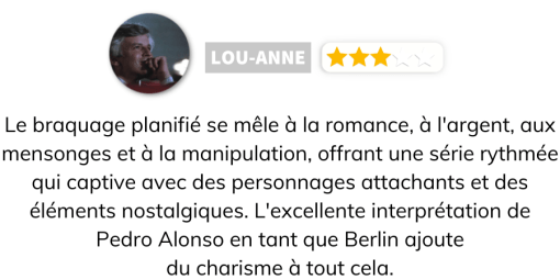 Berlin tente de mêler l’atmosphère romantique de Paris avec un casse sous tension, mais échoue sur tous les points à cause de personnages caricaturaux et de scènes de romance pour ados (ou pour harceleur). Une extension médiocre de ‘La Casa de Papel’, qui vire constamment au cliché sans jamais trouver son identité.
