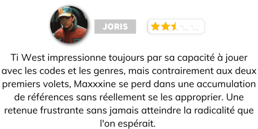 Avec une Mia Goth qui porte bien son nom, MaxXxine se donne les moyens de ses ambitions et se présente comme le slasher de l’été. Dans la veine (pleine de sang) des deux autres films de la trilogie, malgré quelques faiblesses et une conclusion hâtive pas complétement réussie.