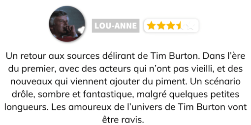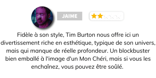 Sur le plan esthétique, on peut voir un Tim Burton inspiré qui fait preuve de malice et prouve qu’il est encore là. Pour le reste, cette suite n’est qu’un joyeux bazar où cohabitent un nombre ridicule de sous-intrigues, qui ne connaissent ni développement ni conclusion. Les enjeux sont absents, les personnages sont négligés et l’ensemble est bâclé.