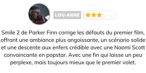 C’est mieux que le premier, en même temps pas très compliqué. Mais le réalisateur Parker Finn fait preuve d’une belle volonté technique, qui pourrait parfois faire rougir certains de ses homologues. Smile 2 est plus fourbe qu’il n’y paraît finalement.