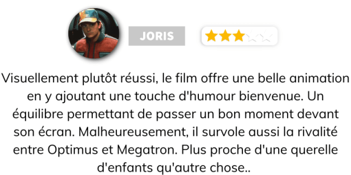 Transformers : Le Commencement, c’est tout ça à la fois, et sur une cadence de camionneurs de l’est. Pas une seule pause, pas le temps de souffler : on ne s’ennuie jamais, grâce à un scénario qui va droit au but. On assiste à l’évolution d’une amitié entre Mégatron et Optimus Prime, qui se détériore progressivement. Plus compréhensible d’ailleurs du côté d’Optimus, car est mieux écrit que Megatron. Ce dernier peine à convaincre avec son basculement brutal du côté obscur de la mécanique. En termes de développement, les personnages secondaires sont un peu laissés de côté. Bumblebee tire son épingle du jeu en tant que sidekick, avec des blagues bien placées et un rôle qui fait sourire, mais bonne chance pour vous souvenir de ce que font les autres. À quoi sert Elita-1, à part nous rappeler la douce voix de Scarlett Johansson ? La naïveté du scénario empêche le film d’atteindre des sommets de notation, mais Transformers : Le Commencement offre un nouveau départ rafraîchissant à une franchise qui en avait cruellement besoin. Coloré, nerveux et souvent drôle, ce nouveau projet, produit par Michael Bay, devrait combler la majorité des fans d’animation… Et peut-être même ceux qui espèrent voir un jour leur Porsche 911 se transformer en Optimus Prime.