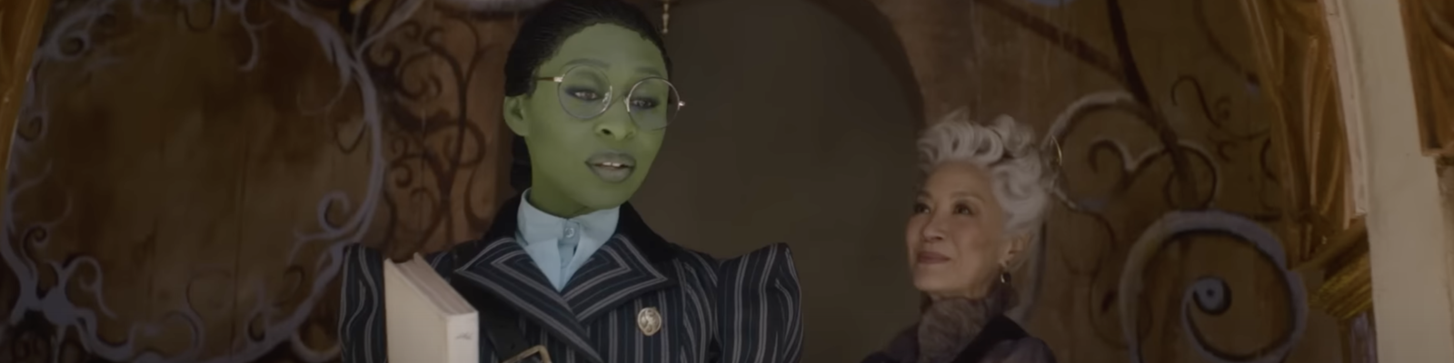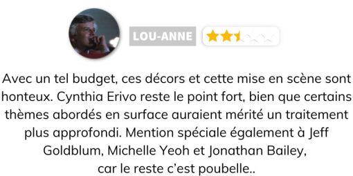 On attendait aussi avec impatience la performance d’Ariana Grande dans ce rôle, et bonne surprise, elle s’en sort très bien, tout comme Cynthia Erivo. Toutes deux livrent ce qu’on attendait d’elles. Le problème, c’est qu’on ne croit tout simplement pas à leurs personnages. Deux trentenaires dans un environnement d’étudiants (eux-mêmes avec des comportements de collégiens).. Avec de vrais adultes dans les rôles principaux, tout semble niais, pas crédible, très artificiel. Ça pourrait passer si l’atmosphère magique/fantastique du film avait été mieux exploité, mais ce n’est pas le cas. Wicked est plus proche de la Fac de Nanterre que de l’université de Shiz. Et ça malgré tout le talent du casting. Pour le reste, que c’est long. Deux heures quarante, pour deux heures de petites moqueries enfantines où le réalisateur insiste sur tous les aspects du racisme de façon très peu subtil. On doit multiplier le temps de ces séquences par deux, pour en plus laisser place à chaque chanson. Au final, le long-métrage manque cruellement de réinterprétation. Un petit rafraîchissement de façade dela narration pour mieux l’adapter à notre époque aurait été très utile. Au lieu de cela, Wicked devient une interminable comédie musicale, qui en plus ça, va revenir nous hanter va avec sa deuxième partie prévue l’an prochain..