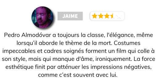 Monotone, vain et surtout très anecdotique, le nouveau long-métrage de Pedro Almodovar ravira ses adorateurs et laissera de marbre les autres. C’est mineur, et bien trop froid pour être ravageur. Tilda Swinton vole cependant la caméra, et apporte à travers son personnage une perspective très intéressante des sujets abordés.