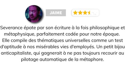 Le final laisse une nouvelle fois cette frustration d’une intrigue suspendue en plein élan, avec un cliffhanger qui nous prend littéralement par surprise. On se retrouve déjà à compter les jours avant le retour de Severance, prêts à plonger à nouveau dans cet univers fascinant.