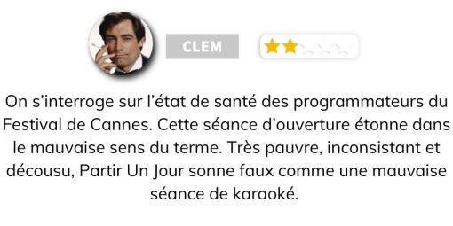 Et même si elle tente de s’éloigner d’un récit trop linéaire par une mise en scène délicate et travaillée, le constat demeure : le film semble s’appuyer davantage sur son ambiance que sur l’évolution de son intrigue, qui tend à se figer au lieu de prolonger ses questionnements. Qu’on soit clair, Partir un jour est une belle ouverture de Cannes : festive, lumineuse et musicale.