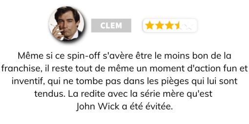 Au final, Ballerina ne cherche pas à être autre chose qu’un bon film d’action bourrin et efficace. On pose le cerveau, on s’installe, et on laisse Ana de Armas dérouler son ballet de baston. Parfois absurde, souvent excessif, mais c’est divertissant. C’est un petit plaisir coupable, un film récréatif qui fait le taf. Et dans le genre, c’est déjà pas si mal.