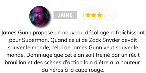 Un Superman fun et coloré, porté par un vrai désir de renouer avec l’icône pop. Mais malgré quelques scènes efficaces, le film souffre d’un récit creux, de personnages sous-exploités, de développements superficiels et de dialogues artificiels. L’ensemble amuse par moments, mais manque sérieusement de profondeur et échoue à établir les fondements de son univers.