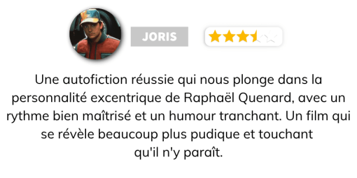 Qui aurait pu s’attendre à ce demi-biopic sur Raphaël Quenard ? Ce n’est pas comme si on le voyait partout, tout le temps depuis 2020, mais Hugo David voulait a priori en remettre une couche.. Pour l’occasion, le jeune réalisateur se lance dans une exploration, pas sans humour, de son amitié à la fois particulière et torturée avec l’acteur français du moment. Un pari risqué, voire un peu bancal, mais qui a tout de même la caution Festival de Cannes 2025 (dans la catégorie Cannes Classics).