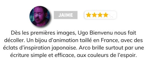 Arco est une fable écologique et utopiste, qui, malgré un scénario peu novateur et une intrigue déjà bien connue des salles obscures, réussit à séduire par son ton lumineux et profondément humain. Une touche de sensibilité nécessaire et attendrissante, menée par une pléiade de personnages attachants, aux problématiques actuelles, qui méritent d’être bien plus écoutées. La mauvaise communication est ici le socle même des éléments déclencheurs de multiples péripéties que le long-métrage nous a concoctées. Et pourtant, malgré la gravité des événements mis en scène par Ugo Bienvenu, ce projet garde une forme de luminosité et d’espérance dans ce chaos climatique. Ce dernier étant parsemé de tempêtes et d’incendies dévastateurs. À cela s’ajoute une touche d’émotion sincère et particulièrement efficace, qui saura (on l’espère) toucher le jeune public auquel le film s’adresse. Une indéniable réussite qui mérite son coup d’œil en salles de cinéma cette année.