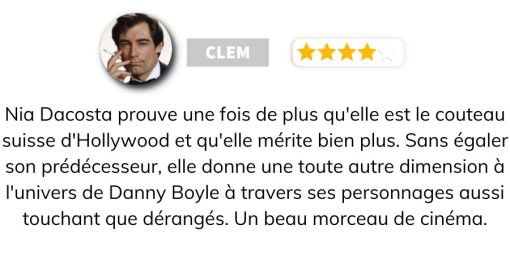 Suite audacieuse et pleinement maîtrisée, Le Temple Des Morts affirme la vision de Nia DaCosta, tout en respectant l’héritage de la saga. Plus posé, plus violent, le film se recentre sur l’humain, multiplie les idées fortes, assume un ton pop dérangeant et s’appuie sur des interprétations marquantes.