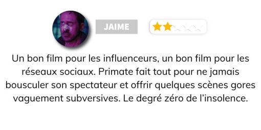 Primate est d’une extrême fainéantise et ne surprend quasiment jamais. Si ce n’est par le sort carrément cruel et brutal réservé à certains personnages. Autrement, le long-métrage décide de casser son rythme et son efficacité en laissant barboter ses protagonistes dans une piscine, annihilant toute tension. À défaut d’un slasher bestial et rafraîchissant, on se retrouve face à un film affreusement balisé, où les directions, actions et réactions des personnages flirtent dangereusement avec le ridicule et le cliché. Mention spéciale au duo de jeunes garçons, complètement lunaires dans leur manière de s’immiscer dans l’intrigue, uniquement pour servir de chair à canon et ralentir encore plus le rythme d’un récit déjà bien malade. Johannes Roberts prend trop son temps et n’arrive jamais à mettre en scène la menace de manière horrifique. Le film ne joue jamais avec son décor, son éclairage, ni même avec les aptitudes ou handicaps des personnages. Les enjeux sont pauvres, pour ne pas dire absents, et on se demande pourquoi le film est ce qu’il est, et pourquoi il n’est pas plus qu’un simple slasher carpenteresque, auquel il multiplie pourtant les références appuyées.