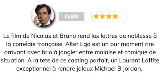 Alex Floutard découvre que son nouveau voisin est son parfait sosie. Mais Axel Chambon semble être une version améliorée de lui-même : plus drôle et sans calvitie. Alter ego est un film français réalisé par Nicolas et Bruno, sorti en 2026. Le film est présenté en avant-première au Festival international du film de comédie de l’Alpe d’Huez et est également projeté au Festival international du film fantastique de Gérardmer 2026.
