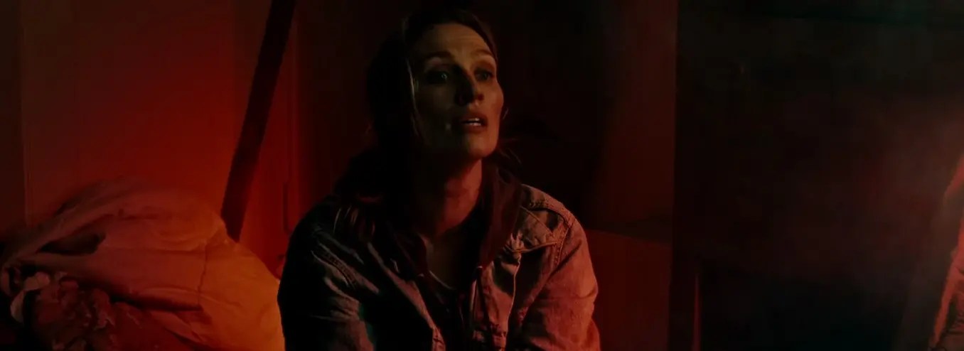 Le fait de traquer sa proie à travers une infinité de mondes offre un terrain de jeu intéressant, et les McManus ont l’intelligence de démarrer l’histoire là où la plupart l’auraient achevée. En effet, ici, le mal a déjà été commis et il est irréversible. Le voyage entre les univers ne sert pas à réparer le passé, mais à punir le coupable sur toutes les versions de la réalité. Un postulat de départ qui suscite l’intérêt, et le début du film est en ce sens extrêmement prometteur. Les réalisateurs font le pari de zapper toutes les explications scientifiques sur le multivers pour aller directement à l’essentiel. Puisqu’Hollywood nous bombarde avec ce concept depuis des années, le public est déjà briefé. Il est inutile de le faire davantage. Les frères McManus choisissent de traiter le sujet directement en introduisant le titre sur un plan magnifiquement composé, baigné dans une lumière désaturée qui annonce la couleur. Cette patine grisâtre, presque poisseuse, crée une ambiance morose qui s’harmonise parfaitement avec la quête d’Irene, le personnage principal. S’ensuit un premier acte qui enchaîne avec un meurtre d’une violence froide, suivi d’une course-poursuite nerveuse. La caméra à l’épaule nous immerge dans l’action, dans l’urgence, et se termine par un premier saut dimensionnel qui établit les fondements d’une traque esthétique et intense à venir. On pense alors tenir une version méta de Terminator, portée par une Michaela McManus qui insuffle à son personnage d’Irene une fragilité et une rage née du désespoir qui rappellent un peu la Sarah Connor des grands jours.
