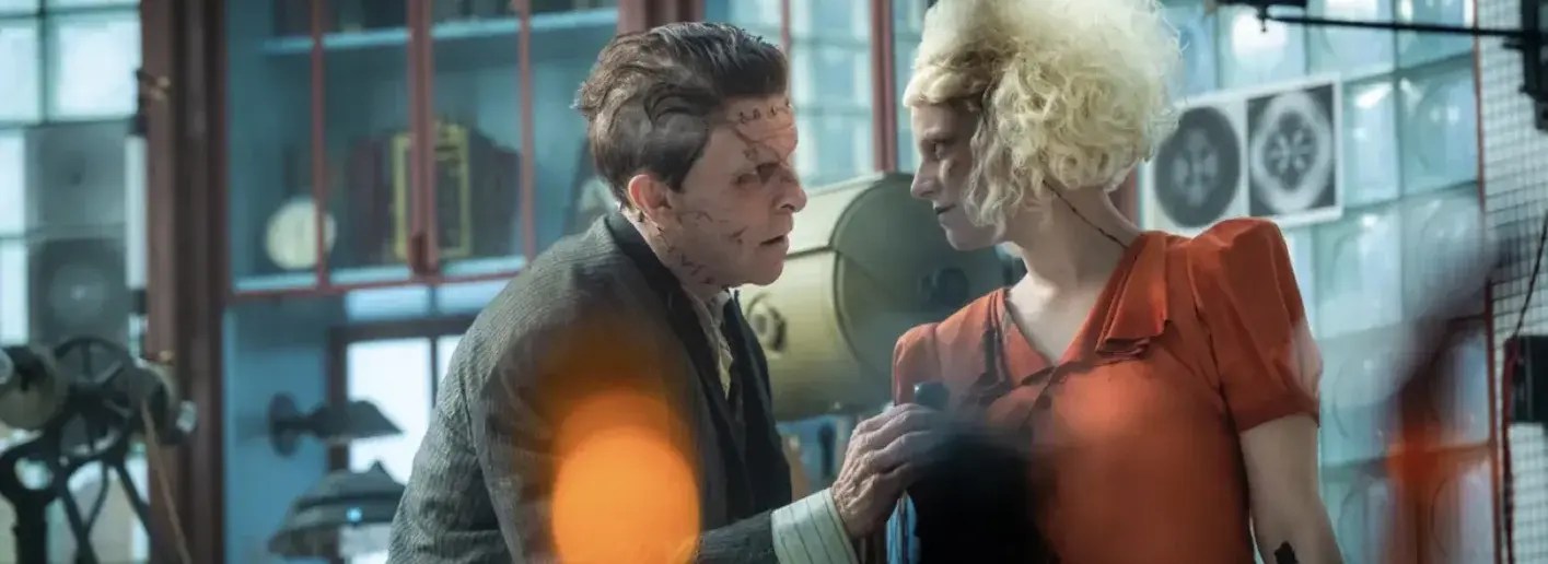 Introduction lente et volontairement loufoque, mêle le noir et blanc aux couleurs : un ton et une direction que Maggie Gyllenhaal poursuivra sur ses 2H10 de récit. Car si cette réadaptation a bien un point fort, c’est bien sa dimension féministe qui insuffle une symbolique forte à la protagoniste, au travers d’une quête d’identité et une construction sous coke, et surtout sous le prisme du couple en parallèle d’une cavale. La monstrueuse Fiancée est incarnée par une Jessie Buckley complètement habitée par ses démons, et la narratrice même du mythe, une sorte de Joker inversé, blond et désordonné, et surtout sponsorisé par Marty Supreme. Face à elle, son monstrueux acolyte, Frank, incarné par un Christian Bale, est à contrario une créature doudou et quasi-pathétique qui nous fait aussitôt oublier la version d’Elordi (2025). Le duo est difforme et déséquilibré à l’image d’un pantin et de son marionnettiste. Maggie Gyllenhaal nous fait oublier l’initiateur du mythe pour recentrer son récit sur la Fiancée, de personne, et évince le regard masculin traditionnellement associé à l’histoire.