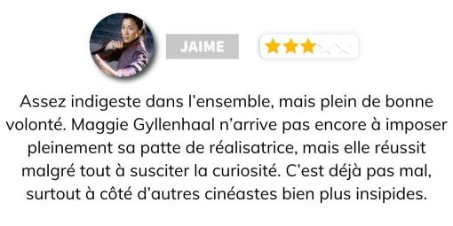 En voulant tout intégrer, Maggie Gyllenhaal compacte son récit jusqu’aux plans caméra particulièrement serrés et courts qui nous éjectent de certaines séquences d’actions pourtant centrales. Loin d’un produit formaté à la sauce hollywoodienne, la cinéaste reste fidèle à son univers et sa vision artistique mais nous livre un ensemble difforme et étrangement unique.